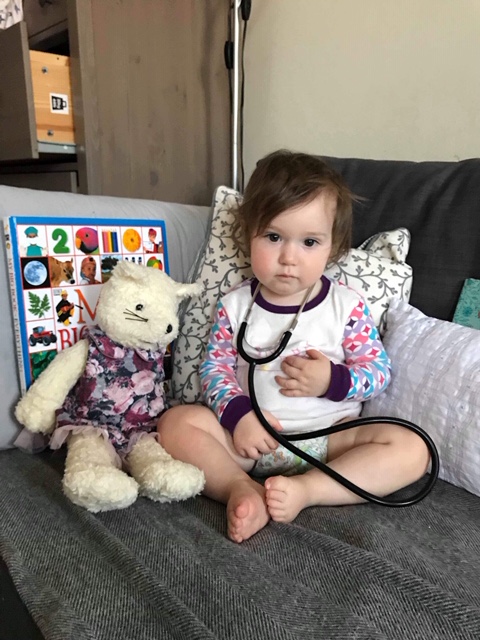 With stethoscope or without Sophia liked hanging out on the couch with her grandma.