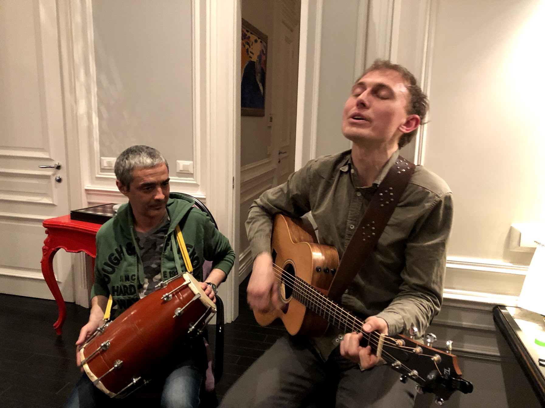 High school friend Max and his girlfriend stopped by our apartment and sang some songs.